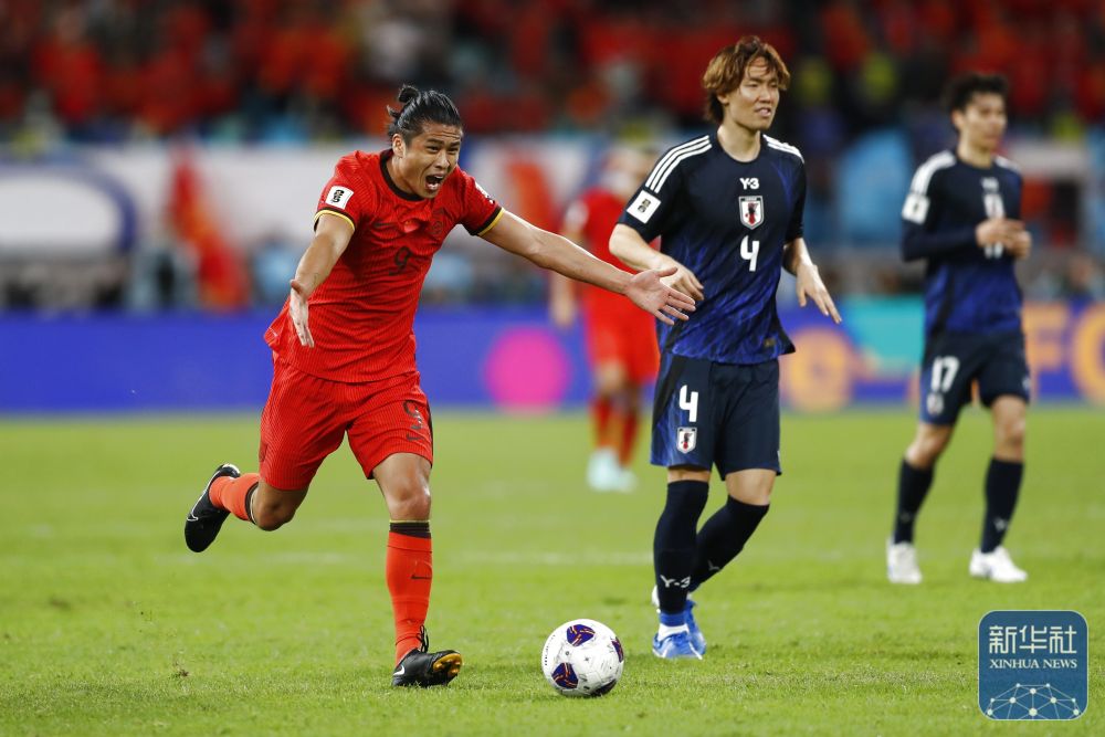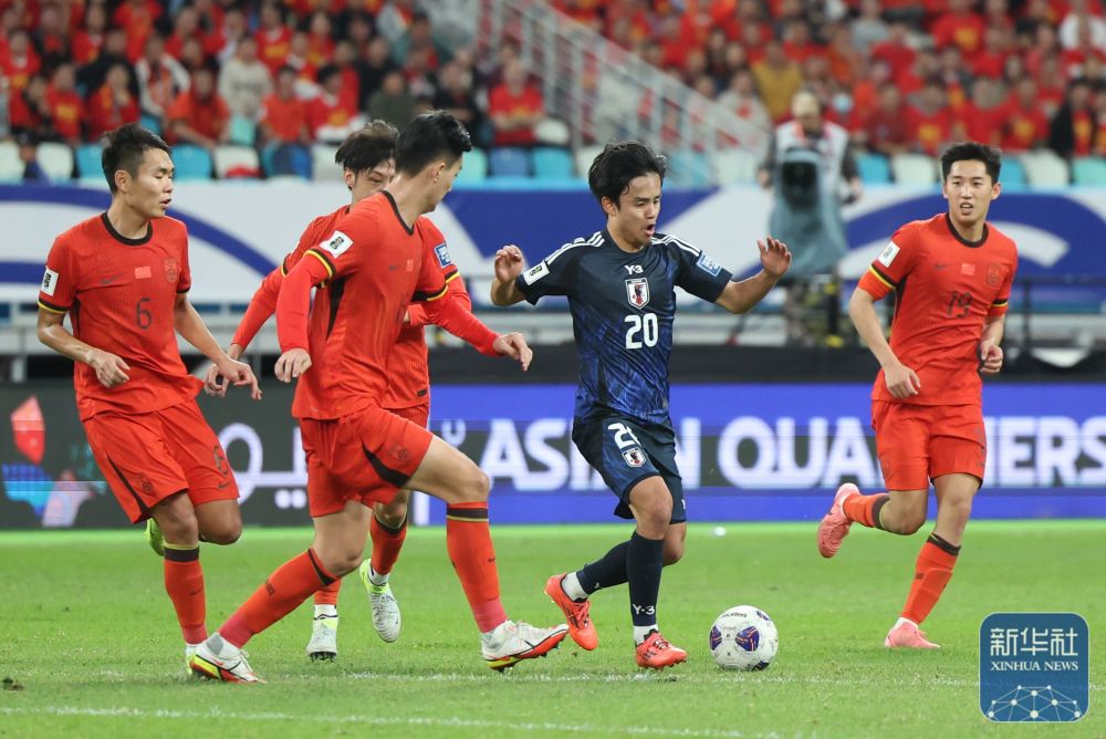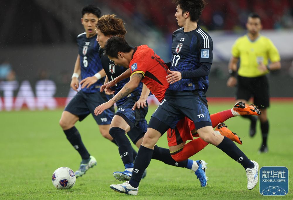 ↑中国队球员徐皓阳(前左)与日本队球员三笘薰拼抢。新华社记者 姜克红 摄
