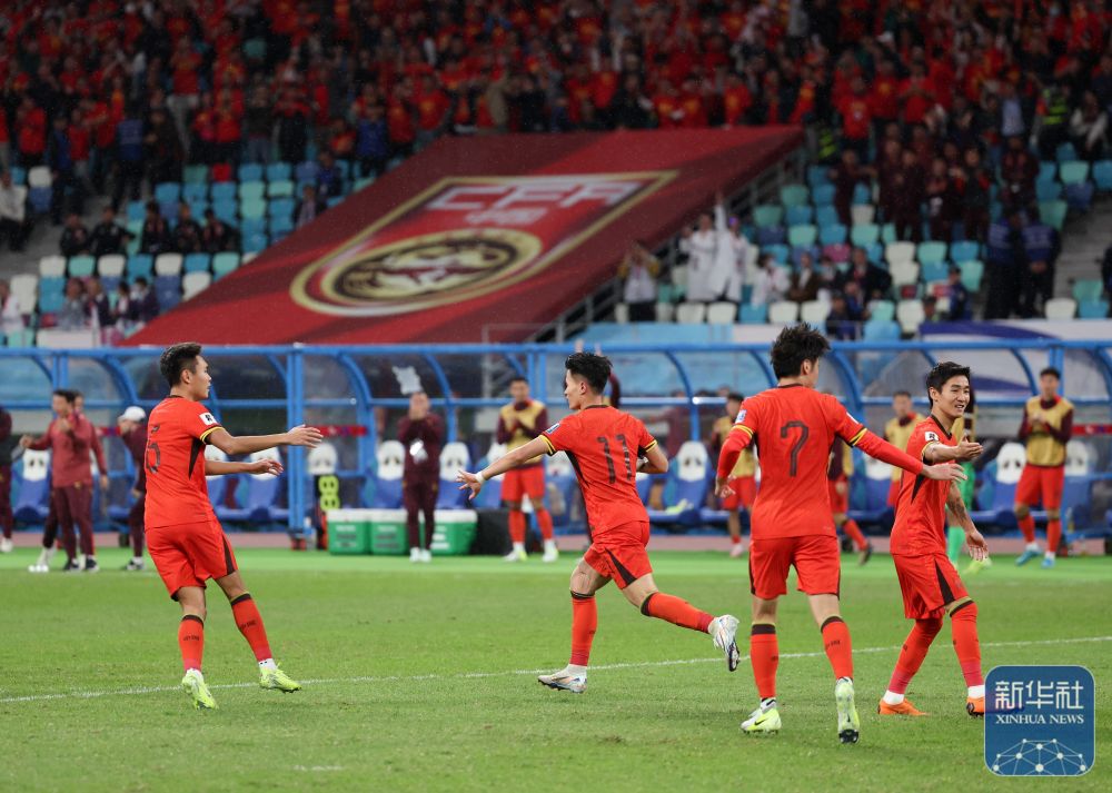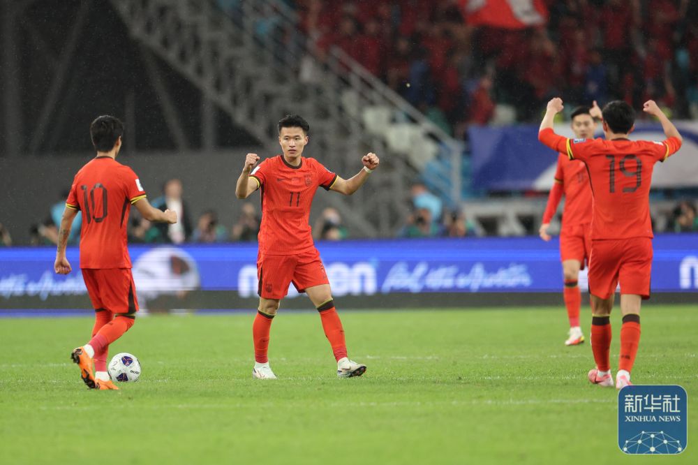 ↑中国队球员林良铭(左二)庆祝进球。新华社记者 姜克红 摄