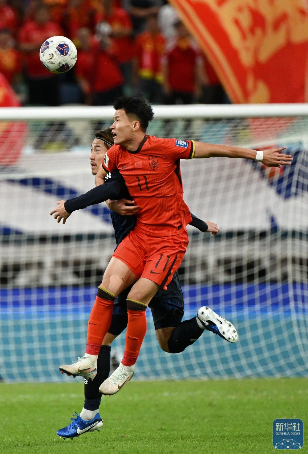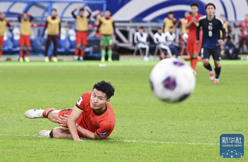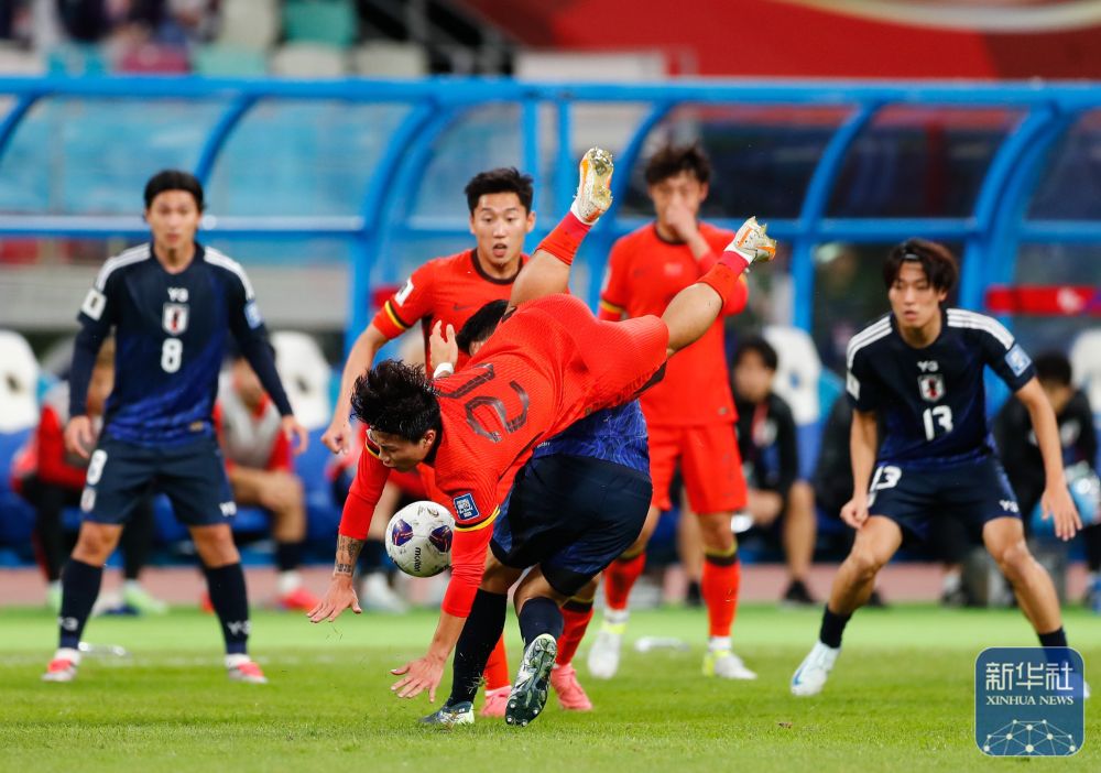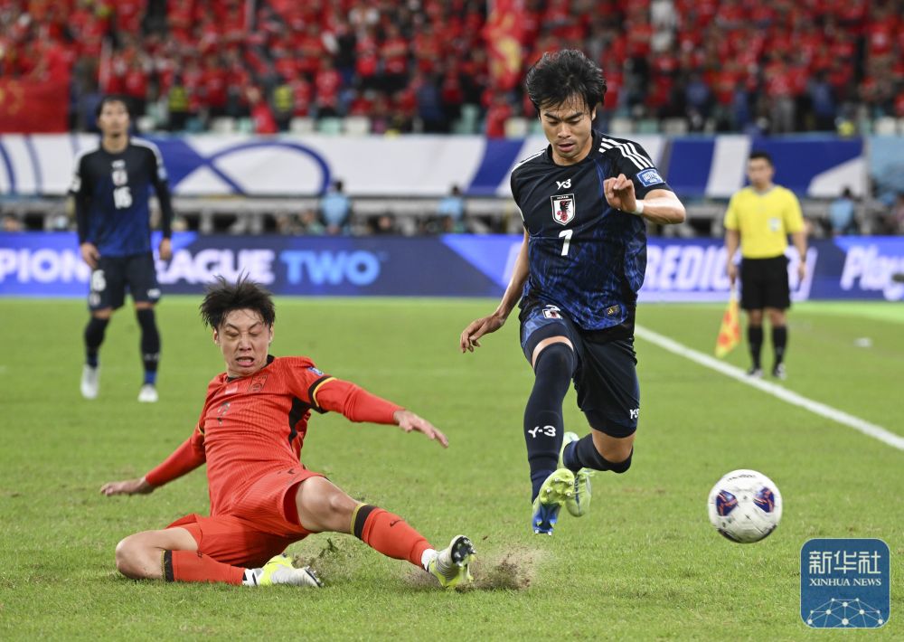 ↑中国队球员林良铭(右)与日本队球员濑古步梦拼抢。新华社记者 魏培全 摄