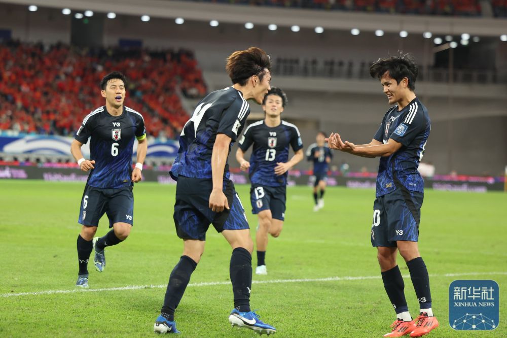 ↑日本队球员在比赛中庆祝进球。新华社记者 曹灿 摄