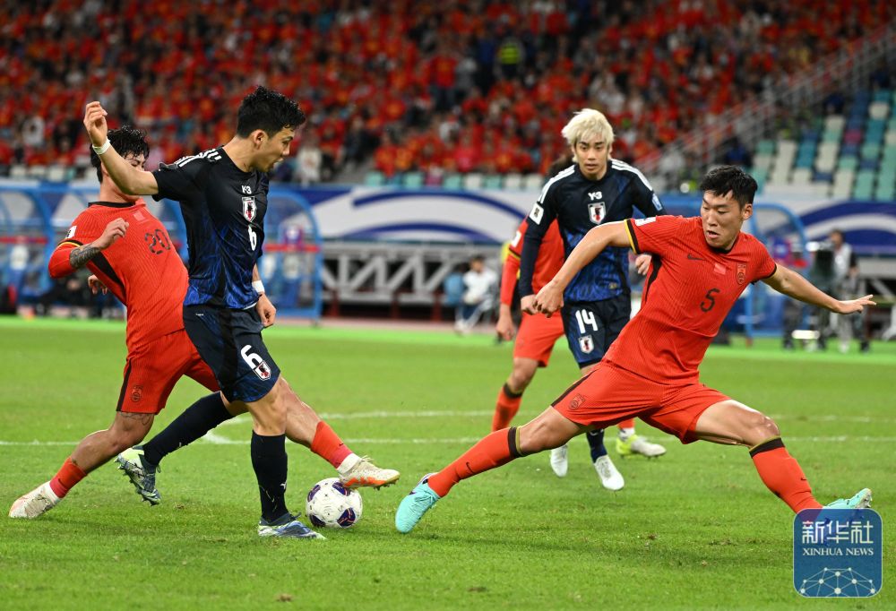 ↑中国队球员朱辰杰(右一)、谢文能(左一)与日本队球员远藤航(左二)拼抢。新华社记者 魏培全 摄