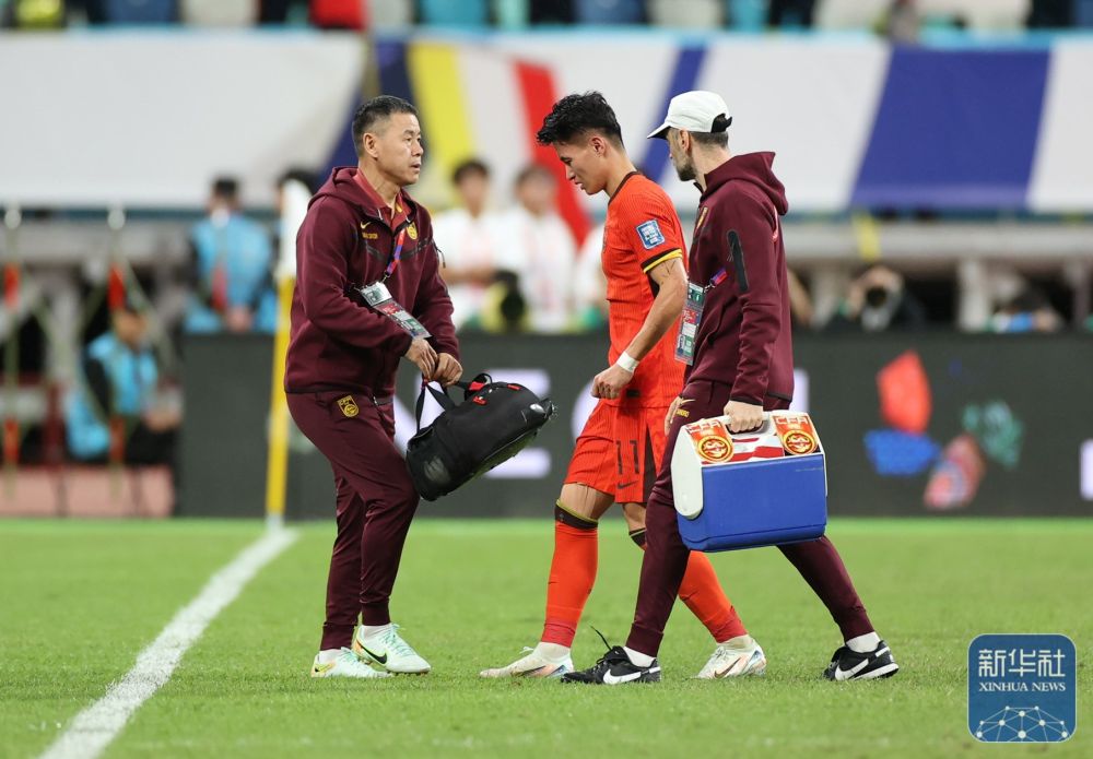 ↑中国队球员林良铭(中)受伤离场。新华社记者 贾浩成 摄