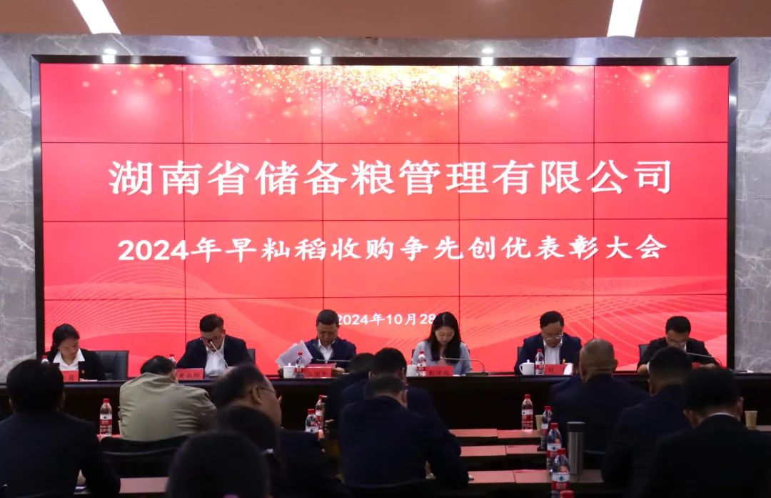 10月28日,省储粮公司召开2024年早籼稻收购争先创优表彰会,树立早稻收购优秀典型,提振员工干事创业精神气。湖南农业集团党委委员、副总经理,省储粮公司党委书记伍湘东,省储粮公司党委副书记、董事长彭诗远出席会议,公司党委副书记黄永阳主持会议。