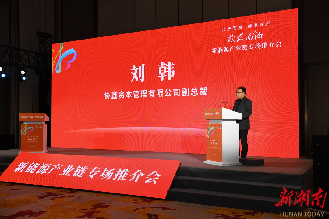 (11月21日,在长沙举行的“校友回湘”新能源产业链专场推介会上,协鑫资本管理有限公司副总裁刘韩发言。湖南日报全媒体记者 田超摄)