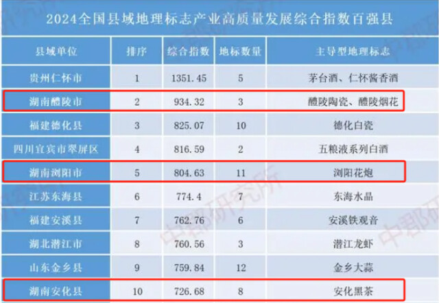 湖南日报11月22日讯(全媒体记者 胡盼盼 通讯员 李锐)近日,北京中郡经济发展研究所联合地理标志特产大全网发布全国县域地理标志产业高质量发展综合指数百强县名单,湖南7个县入选。其中,醴陵市、浏阳市、安化县入选十强县。
