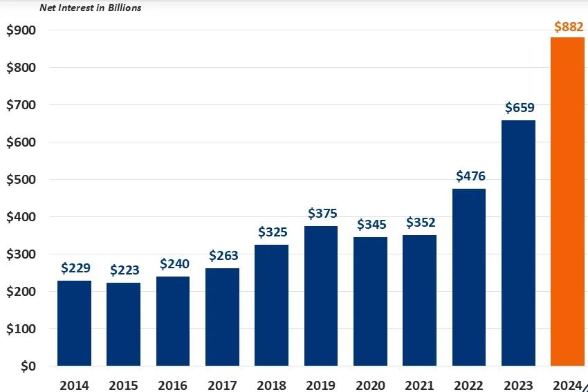 根据美国财政部11月20日公布的数据,2024年美国联邦政府仅用以偿还美债利息的支出就达到了8820亿美元。相较2023年6590亿美元的利息支出,2024年美债利息支出增长率达33.8%。
