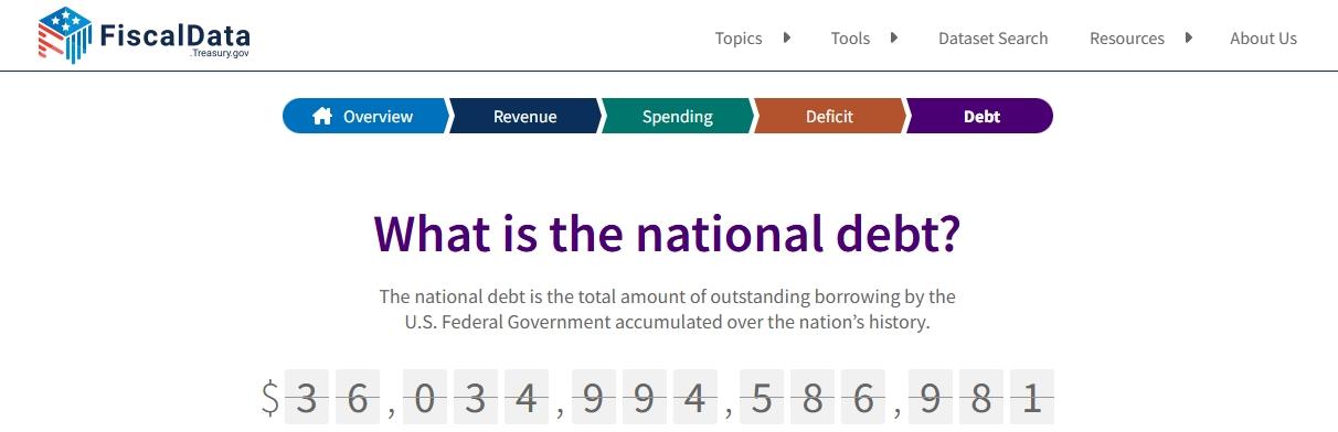 △美国财政部下属的财务数据网站当前数据显示,美国联邦政府债务总额已达到36.034万亿美元。