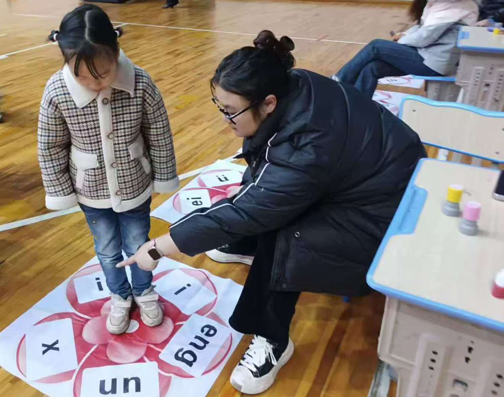 “ri”,夏琪莹话音刚落,她对面的一个小男孩拿起一个充气锤迅速地砸在头顶上印有“ri”的小地鼠图案上。11月21日9时30分,第一节课还没下课,此时的武冈市思源实验学校体育馆内早已是人声鼎沸,各种拼音拼读声、砸地鼠的嘭嘭声此起彼伏,经了解,原来是该校小学部一年级的“爱‘拼’才会赢,‘音’你而精彩”拼音过关活动在此举行。