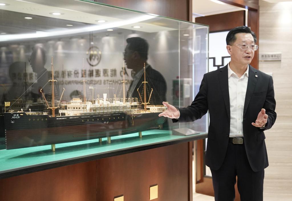 招商局能源运输股份有限公司总经理王永新在介绍中国近代民族航运业拥有的第一艘商船“伊敦”轮(11月15日摄)。新华社发(王申摄)