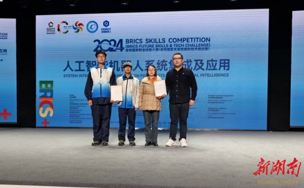 湖南日报·新湖南客户端11月27日讯(通讯员 黄冠棋 顾丽)近日,由俄罗斯技能发展署(俄罗斯世界技能)、俄罗斯战略倡议署、金砖国家工商理事会、鞑靼斯坦共和国政府、俄罗斯科学和高等教育部主办,金砖国家工商理事会技能发展、应用技术与创新工作组承办,教育部中外人文交流中心、金砖国家工商理事会技能发展、应用技术与创新中方工作组、一带一路暨金砖国家技能发展国际联盟联合组织的2024 金砖国家职业技能大赛(金砖国家未来技能和技术挑战赛)国际总决赛-人工智能机器人系统集成及应用赛项在内蒙古电子信息职业技术学院落下帷幕。由湖南化工职业技术学院黄冠棋、顾丽老师指导的工业机器人技术专业22级学生倪亮、肖榕琪代表学校与来自金砖国家的60所职业院校、130名选手同台竞技,最终荣获二等奖,黄冠棋、顾丽老师获评优秀指导教师。