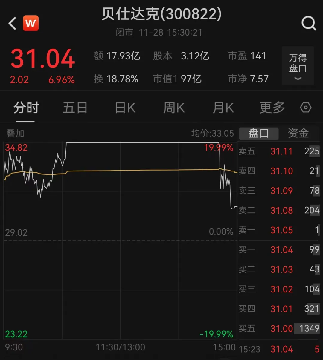 11月28日上午再度20CM涨停,过盘尾突然跳水,截至收盘涨近7%。