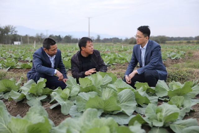 (农行永州道县支行客户经理在田间地头查看包菜生长情况。)