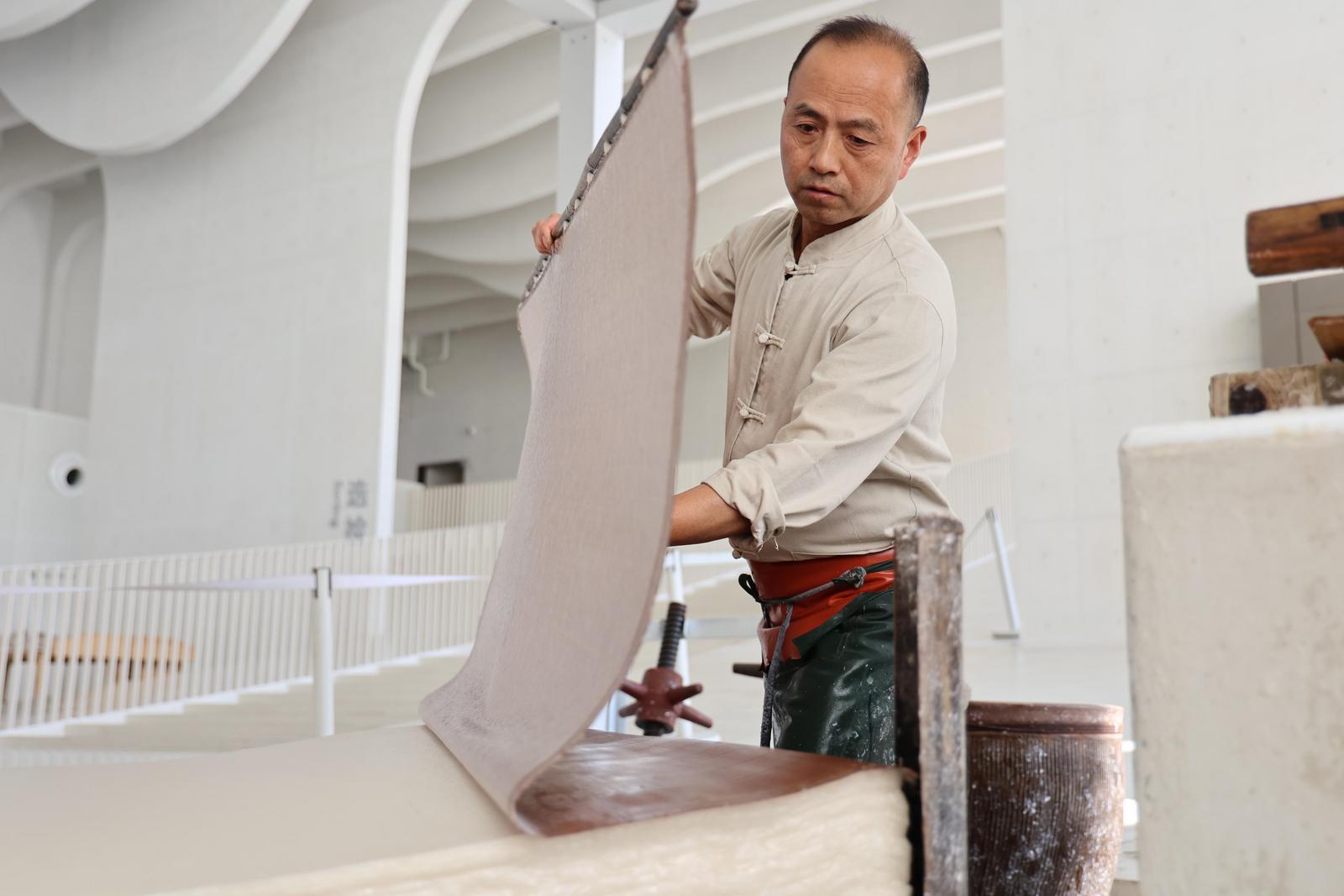 “大国工匠”周东红正在进行捞纸作业(关敬生 摄)“宣纸从池水中一捞一放,一张宣纸立刻成型,不得不佩服老祖宗传承下来的技艺!”来自南京的游客王先生惊叹道。