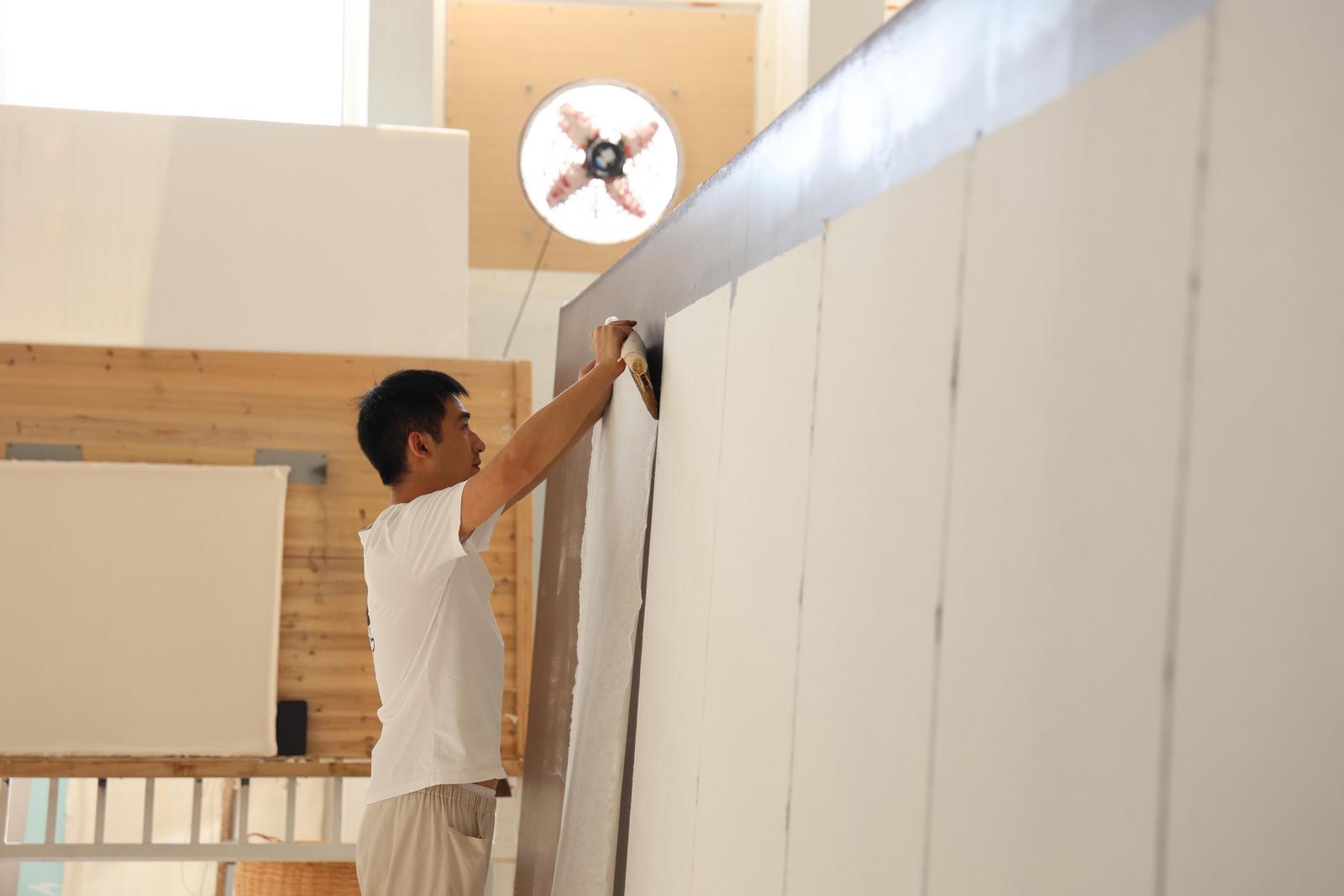 姚云夔正在进行晒纸作业(关敬生 摄)看起来很简单的晒纸,每一步都是技术活。姚云夔介绍,将纸张刷到烘干墙上时,手里的松针刷要刷得平整、严实,并且每一刷的力道都不同。“如果力道都一样,那纸张会晒出皱褶,纸也就废了。每一刷要拿捏得当,既要让纸张有刷痕,又不让刷痕太重。”