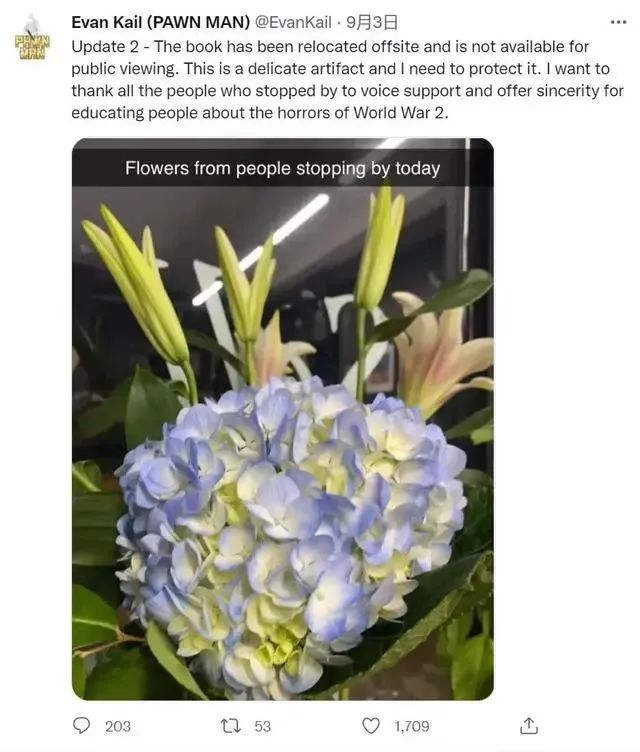 一位在美国的南京留学生给埃文写下一封信。“作为一个来自南京的孩子,我想感谢你保护这本相册,并在世界上展示了我们曾经遭受的苦难。”此外,还有许多中国网友出现在他的店铺里,他们与埃文拥抱,还送来信件、鲜花表达支持。这些都让他坚信,“自己没有做错”。