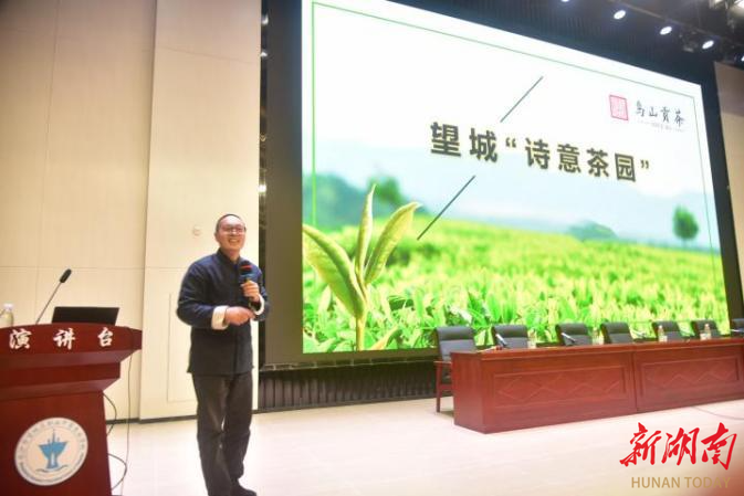湖南望城乌山贡茶业有限公司秦易轩老师作为茶文化的资深传承者,以《望城“诗意茶园”》为题,巧妙引导在座师生探寻茶文化的深厚历史底蕴,详细介绍了乌山贡茶叶有限公司的发展规模、品牌文化、品牌多元发展的历程。同学们被秦易轩的专业知识和热情所吸引,深刻体会到了本土企业的品牌魅力和家国情怀。