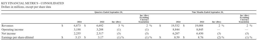 麦当劳2024年第三季度主要业绩指标情况,图/麦当劳2024年第三季度财报。