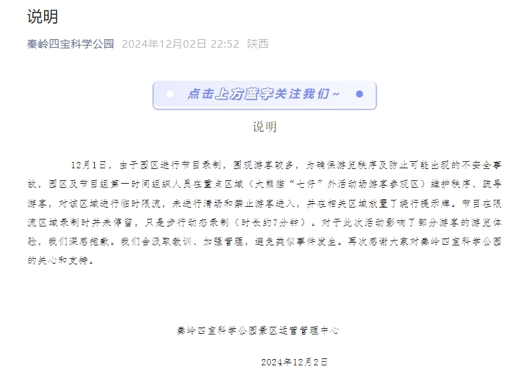 中新网12月3日电 据“秦岭四宝科学公园”微信公众号消息,针对陕西西安秦岭四宝科学公园园区因录制节目影响游客游览体验一事,景区运营管理中心12月2日晚发布说明并致歉。