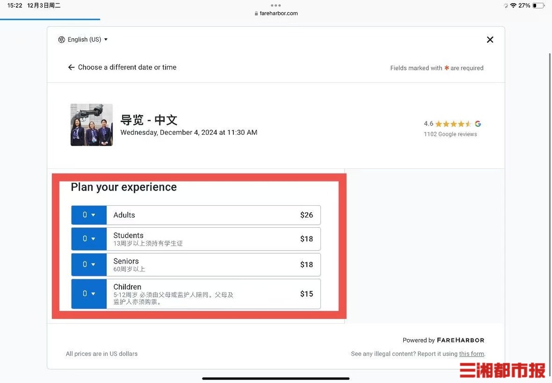 12月3日,记者调查发现,想要和这些“精英”一样踏入联合国的舞台,似乎并非难事。记者通过联合国官网查询发现,进入联合国总部大楼,可以直接通过官方网站进行预约。在“咨询服务”菜单栏的“参观联合国”的选项下,有个人票和团体票两个选项。其中,个人成人票价26美元,学生(13岁以上,持学生证)、老人(60岁以上)票价18美元,儿童(5—12岁)票价15美元。而团体票价格则在344美元—520美元之间,最多允许20人购票。