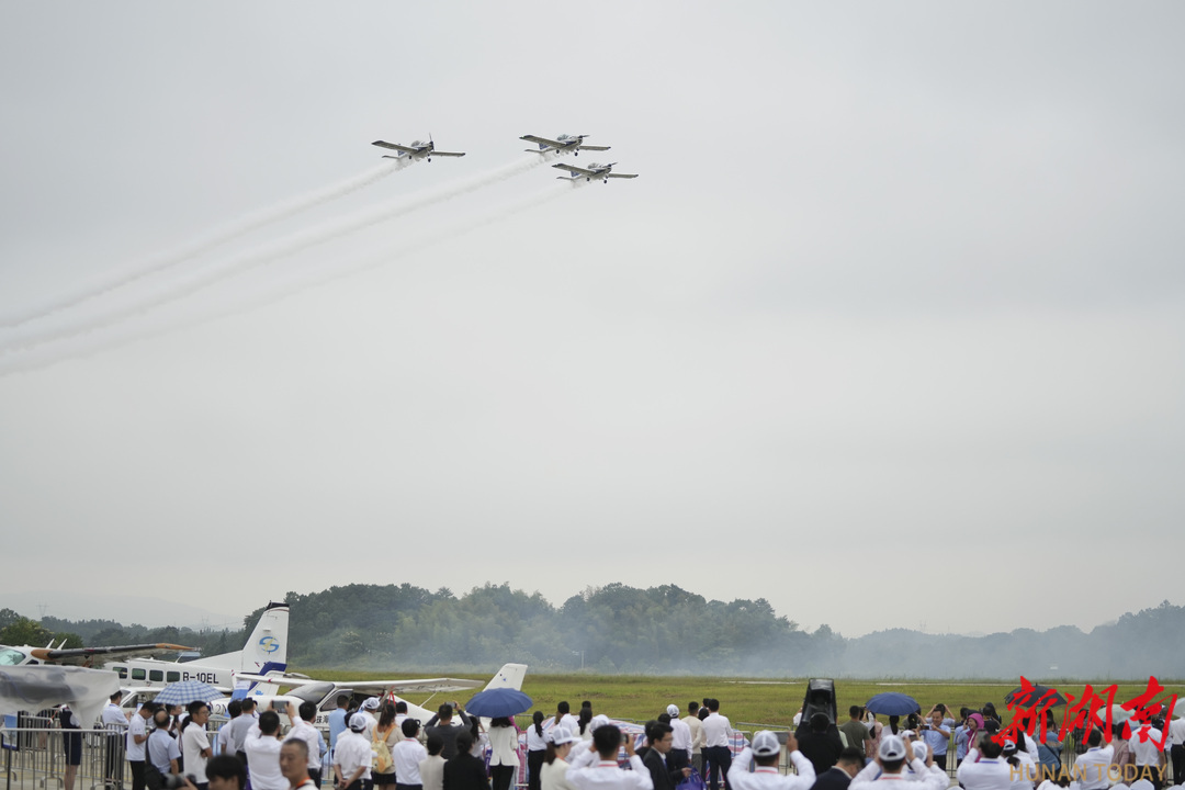 在株洲芦淞机场举行的2023湖南(国际)通用航空产业博览会动态飞行表演让现场观众大饱眼福。湖南日报全媒体记者 辜鹏博 摄