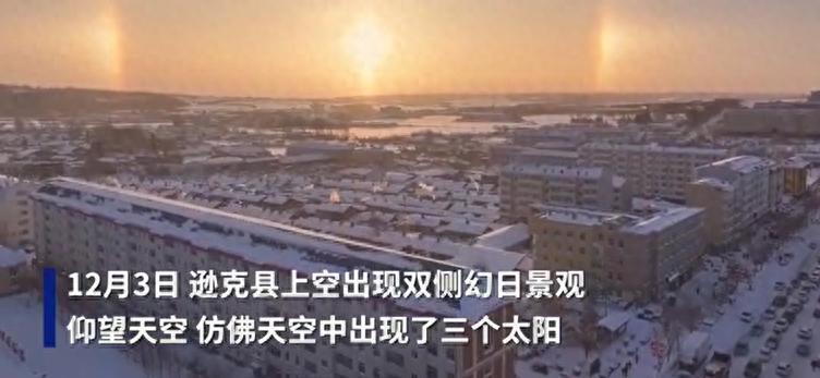 画面中,三个太阳同时“上班”,站位呈现中间高、两边低的布局。据了解,本次幻日景观是因近期根河市气温极低,高空中出现卷层云。由于高空中卷层云里的小冰晶整齐排列,阳光照射后发生规律折射,从而在太阳两边形成较大的光斑,看上去就像是出现了多个太阳。