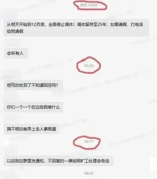 企业负责人安排相关事务后无人回应,确实耐人寻味。根据截图内容,该负责人宣布“停止调休”并@所有人的时间是当天22时05分,爆粗口的时间是4个小时后,即第二天凌晨两点多。对此,网友们的评论几乎一边倒——“老板半夜发信息也要回复吗?”“员工集体不回复,真的不是老板自己的问题吗?”“这种老板,我是一天都不想给他干”……