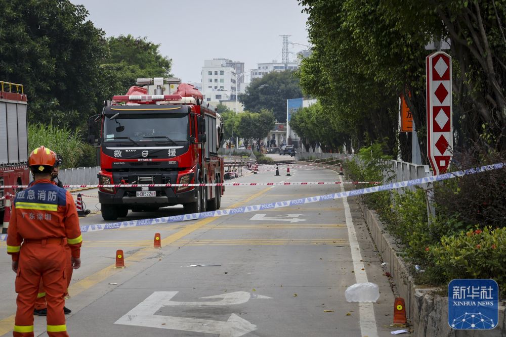 ↑12月5日,在深圳市宝安区航城街道洲石路,坍塌现场边缘100多米外设置了警戒线。新华社记者 毛思倩 摄