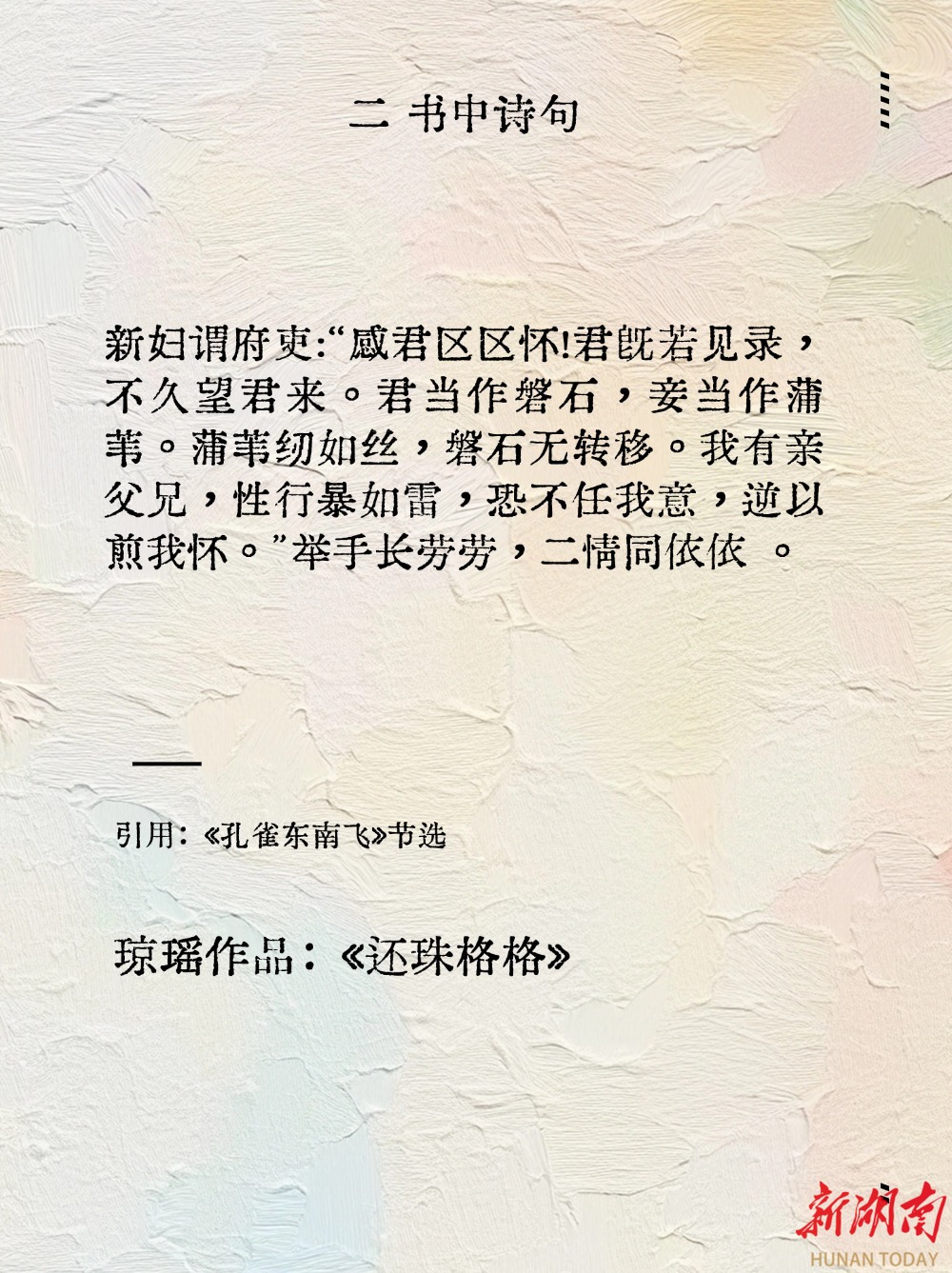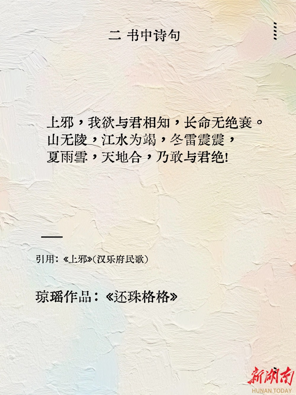 “投我以木桃,报之以琼瑶。”“青青河畔草,绵绵思远道。” “蒲草韧如丝,磐石无转移。” “山无陵,天地合,乃敢与君绝。”