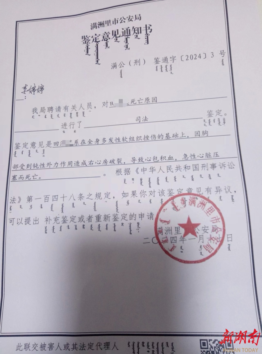 2023年12月21日,李婷婷接到满洲里警方电话,告知女儿田田死亡。田田死亡时年仅2岁7个月。