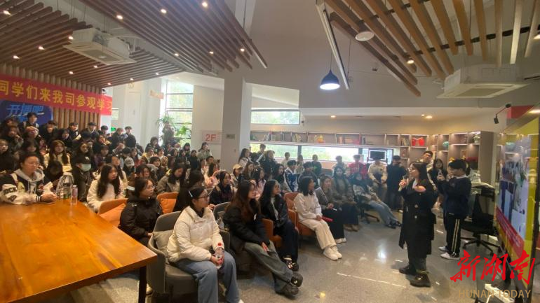 在湖南天合智造文化传媒有限公司,天合教育项目负责人唐飞、公司人力资源负责人易大莉热情接待了师生一行。易大莉介绍了公司的发展历程及“天合智造”“天合教育”“天合盛视”“天合元创”等业务版块,并结合《再见爱人》《现在就出发》等热点节目详细介绍了公司的后期制作等核心业务。在互动环节,易大莉对同学们关心的实习岗位、就业机会等问题作了细致解答。