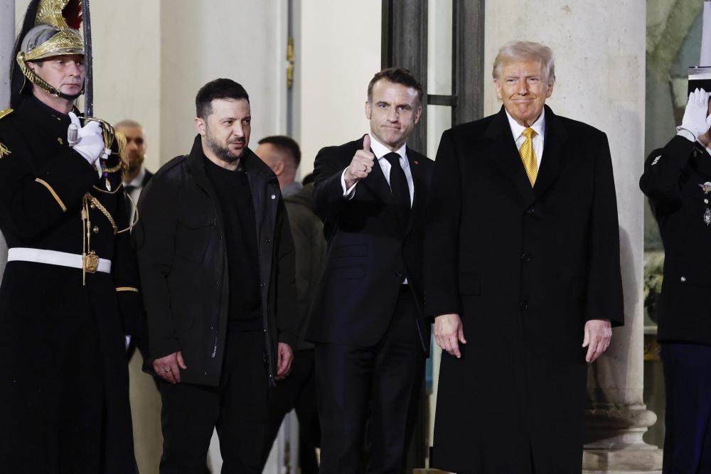 12月7日,法国总统马克龙(中)与美国当选总统特朗普(右)和乌克兰总统泽连斯基会晤后走出爱丽舍宫。新华社发(亨利·施瓦茨摄)