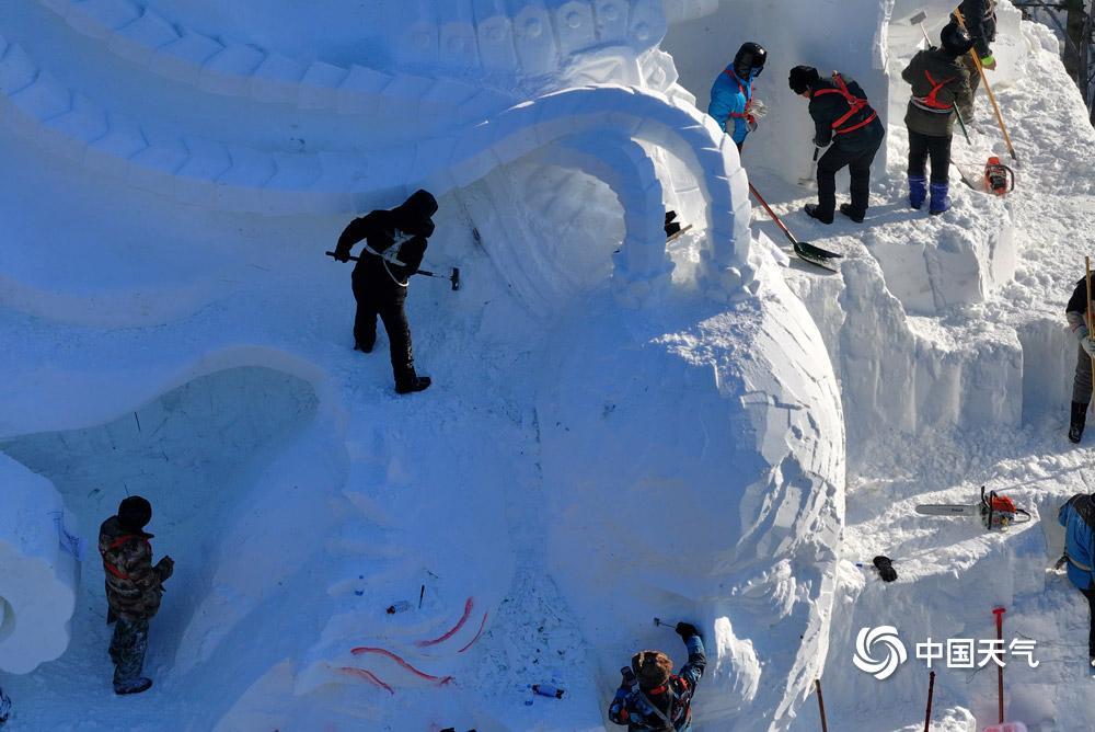 近日,哈尔滨太阳岛雪博会的多座大型雪雕正在紧张施工中,主塑尚在堆塑,即将开始雕刻。(来源:中国天气网)