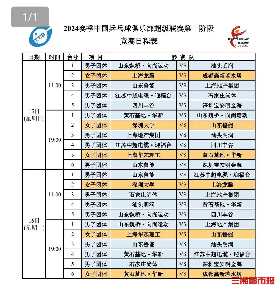 2024乒超联赛第一阶段12月15日—16日赛程发布