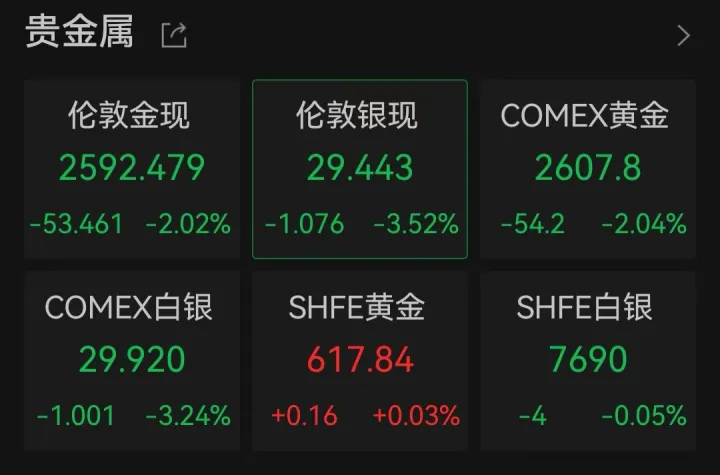 美联储公布利率决议后,现货黄金短线跌幅一度扩大至40美元,截至北京时间5:20,报2592.479美元/盎司,跌幅达2.02%;现货白银大跌超3%,截至北京时间5:20,报29.443美元/盎司。