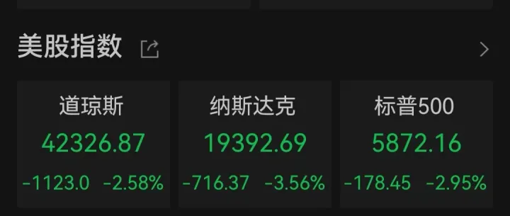 在宣布降息后,美股三大指数全线跳水,由涨转跌,在鲍威尔讲话期间,跌幅持续扩大。截至收盘,道指跌2.58%报42326.87点,标普500指数跌2.95%报5872.16点,纳指跌3.56%报19392.69点。其中,道指十连跌,为1974年10月以来最长连跌。