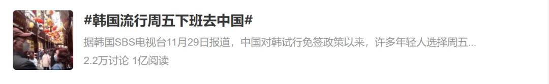报道说,从韩国出发飞到中国,最短只需要一个多小时,现在又免去了办理签证的复杂手续和费用,让韩国赴华游需求得以释放。