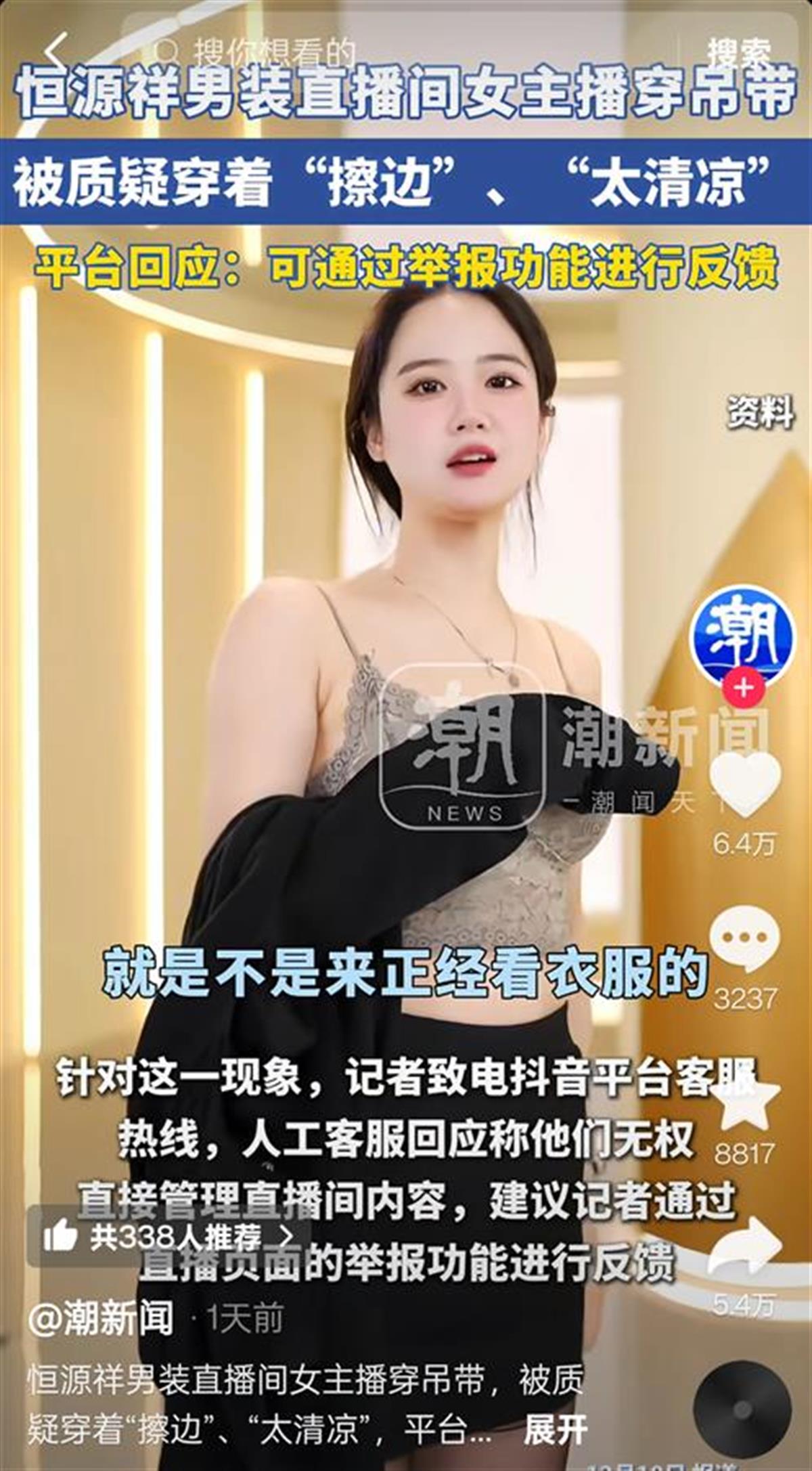 近日,恒源祥直播间的女主播在试衣时疑似“擦边”,引发网友热议。平台人工客服对此回应称,可以举报。