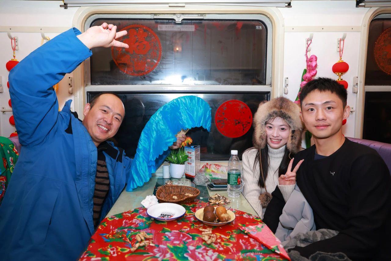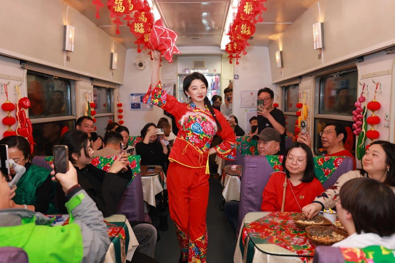 作为首列东北民俗文化主题列车,K7041/7042次列车再次盛装启程,喜迎八方来客。卧铺车厢内铺设东北大花的床单,墙壁上粘贴着窗花贴纸,车窗两边挂满一串串红灯笼,桌面上摆满冻梨、冻柿子……