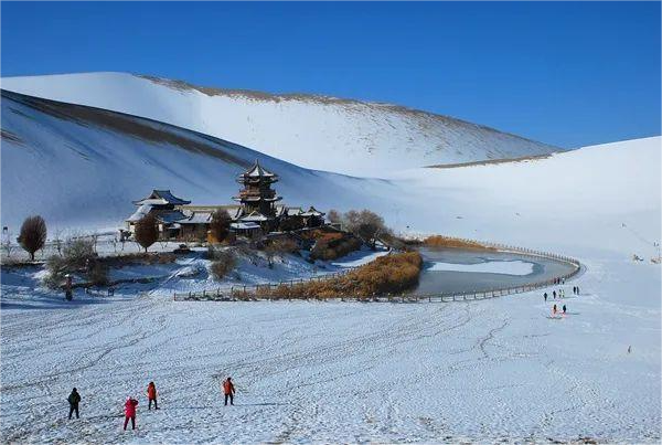 甘肃省敦煌市鸣沙山月牙泉雪景如画 图片源自人民网