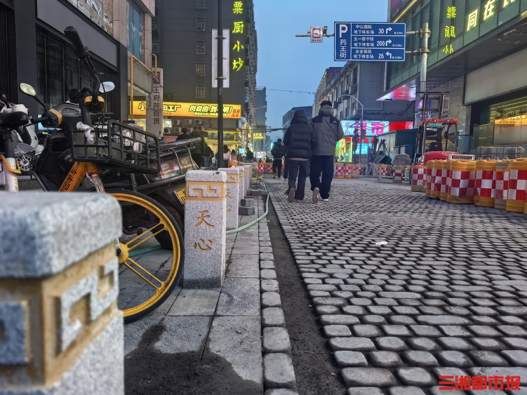 12月21日,长沙药王街路面新铺设了地砖、加装了石柱。罗艾敏 摄