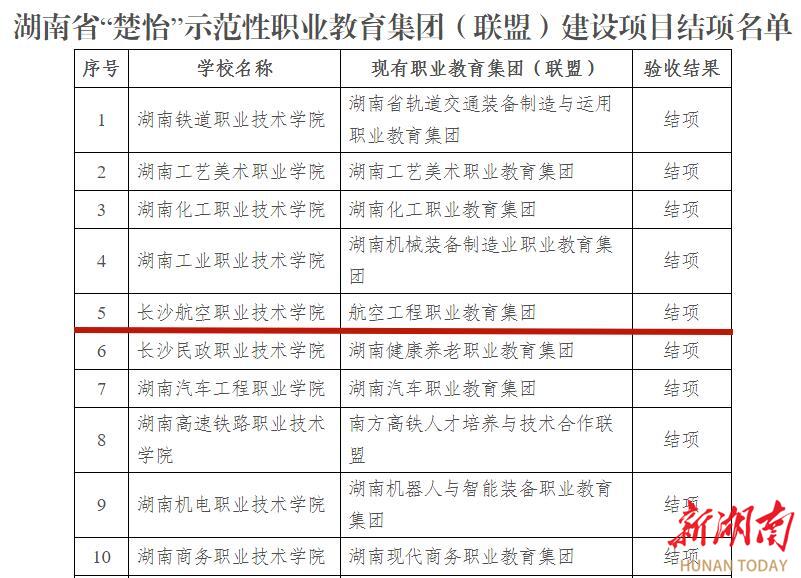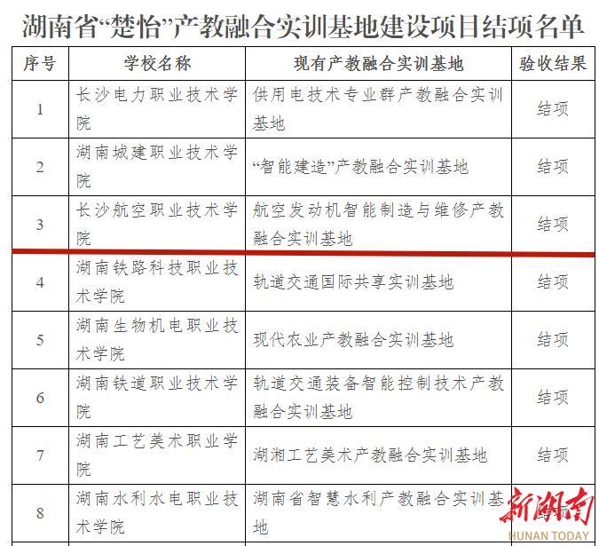 湖南日报12月23日讯(通讯员 刘嫄 刘阳 苏龙)近日,湖南省教育厅发布《湖南省教育厅关于公布“楚怡”行动有关建设项目验收结果的通知》(湘教通〔2024〕252号),长沙航空职业技术学院2022年12月立项的“湖南省‘楚怡’产教融合实训基地”——航空发动机智能制造与维修产教融合实训基地、“湖南省‘楚怡’示范性职业教育集团(联盟)”——航空工程职业教育集团、“湖南省‘楚怡’文化传承基地”——湖南航空馆等3个项目全部通过验收。