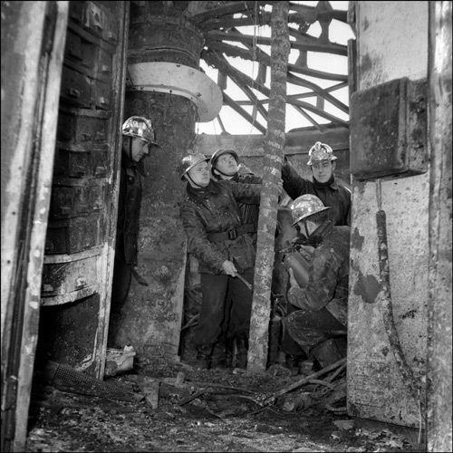 △1956年1月3日,埃菲尔铁塔的塔顶位置发生火灾,消防人员在现场。