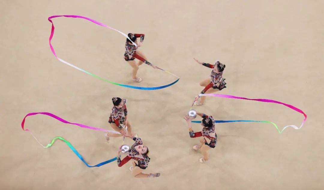 这是2024年8月10日,中国队在巴黎奥运会艺术体操集体全能决赛中。新华社记者 郭昱 摄