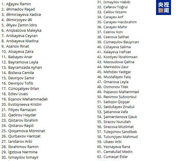 坠机发生后,阿塞拜疆航空公司公布了失事客机乘客和机组人员名单。名单显示,飞机上有62名乘客,5名机组人员。失事客机上共有67人。