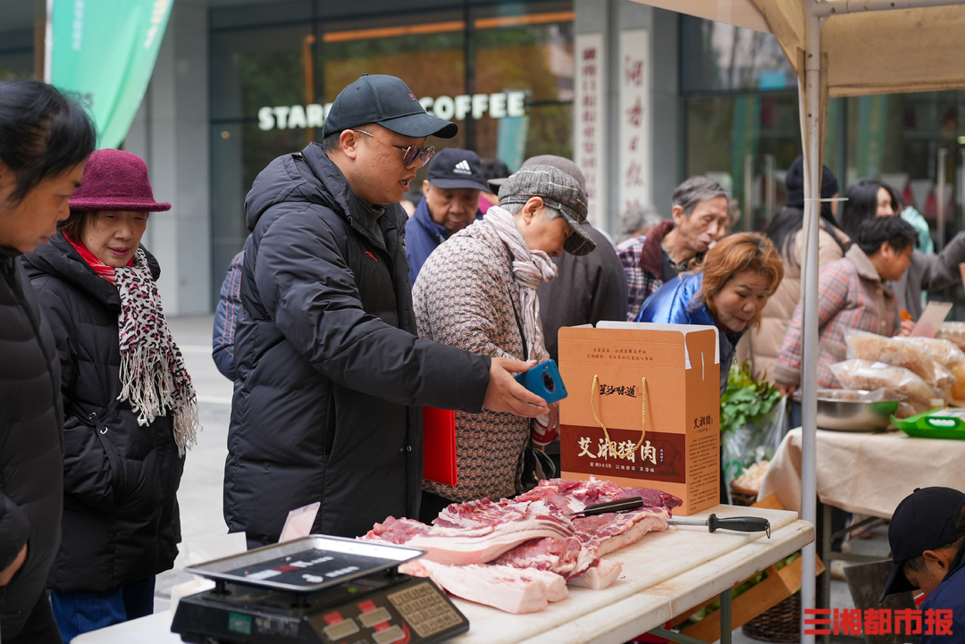 12月26日,长沙市民正在市集年货节上选购猪肉。