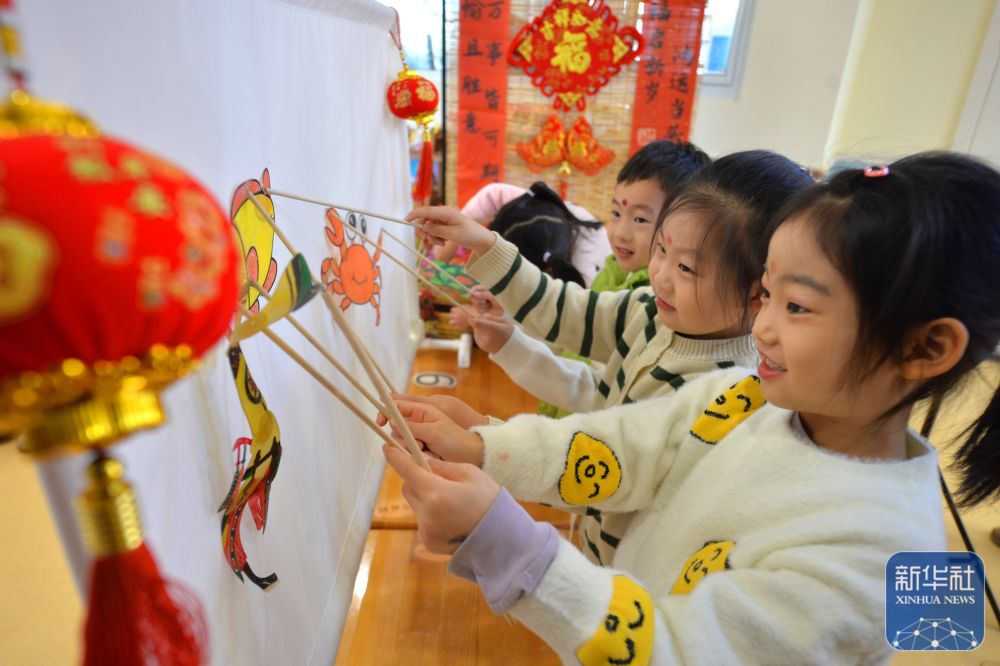 12月26日,在山东省青岛市市北区第七实验幼儿园,小朋友们在表演皮影戏。新华社发(王海滨摄)