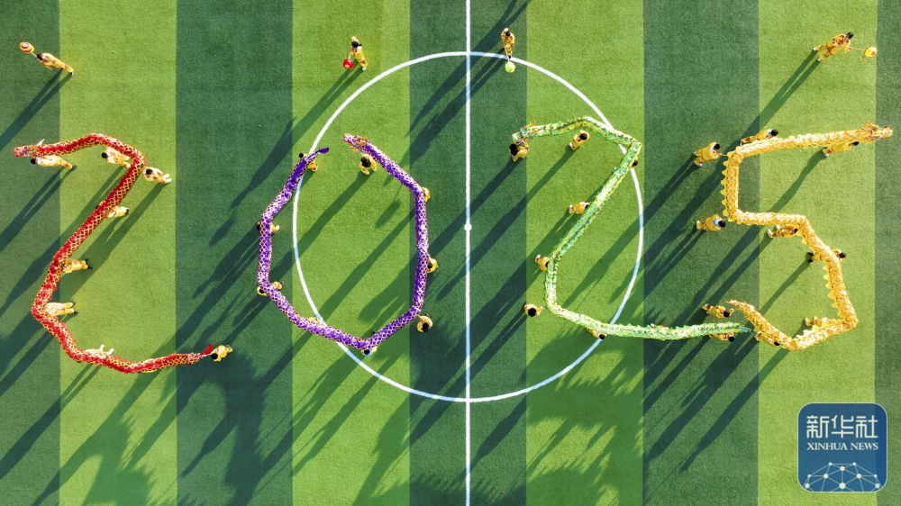 12月30日,江苏省昆山开发区实验学校的学生在操场上舞龙迎新年(无人机照片)。新华社发(王须中摄)
