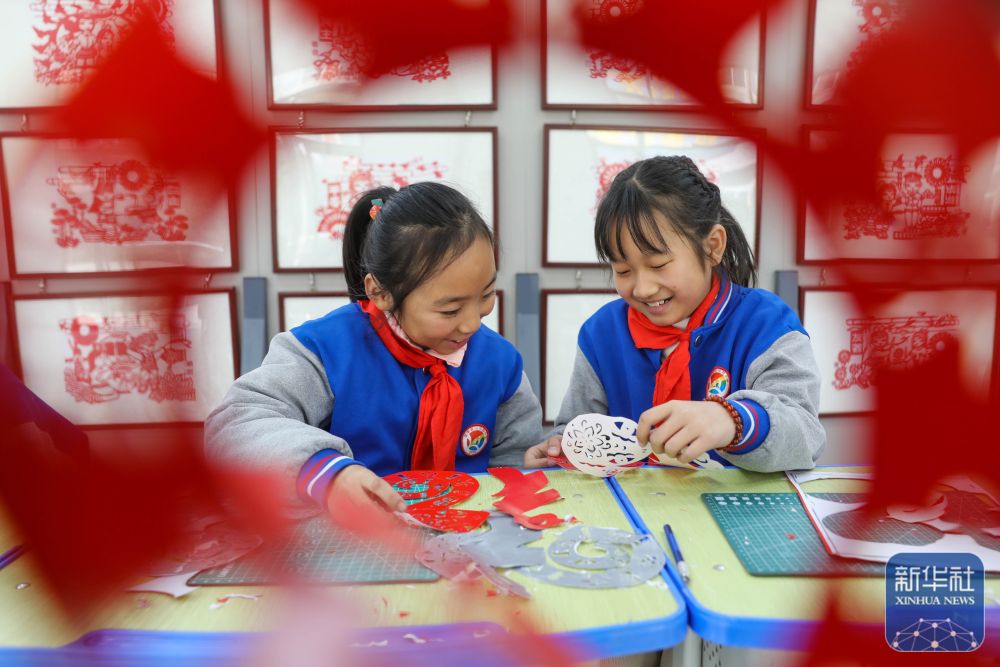12月30日,河南省平顶山市宝丰县山河路小学的两名学生在交流剪纸作品。新华社发(何五昌 摄)