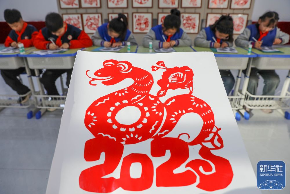 12月30日,河南省平顶山市宝丰县山河路小学的学生在参加剪纸迎新年创作活动。新华社发(何五昌 摄)