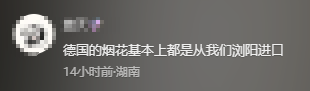 有网友发现装烟花的箱子上写着“Made in China”,不少人提到这应该是湖南浏阳出口的烟花:“德国的烟花基本上都是从我们浏阳进口”、“浏阳烟花啥含金量不用我多说了吧”。